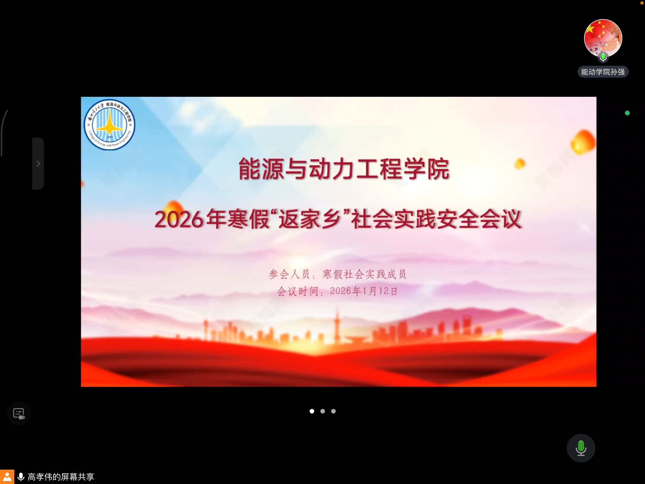 1月12日,能源与动力工程学院团委召开2026年寒假“返家乡”社会实践安全部署会议,学院团委孙强老师及全体实践学生参加。