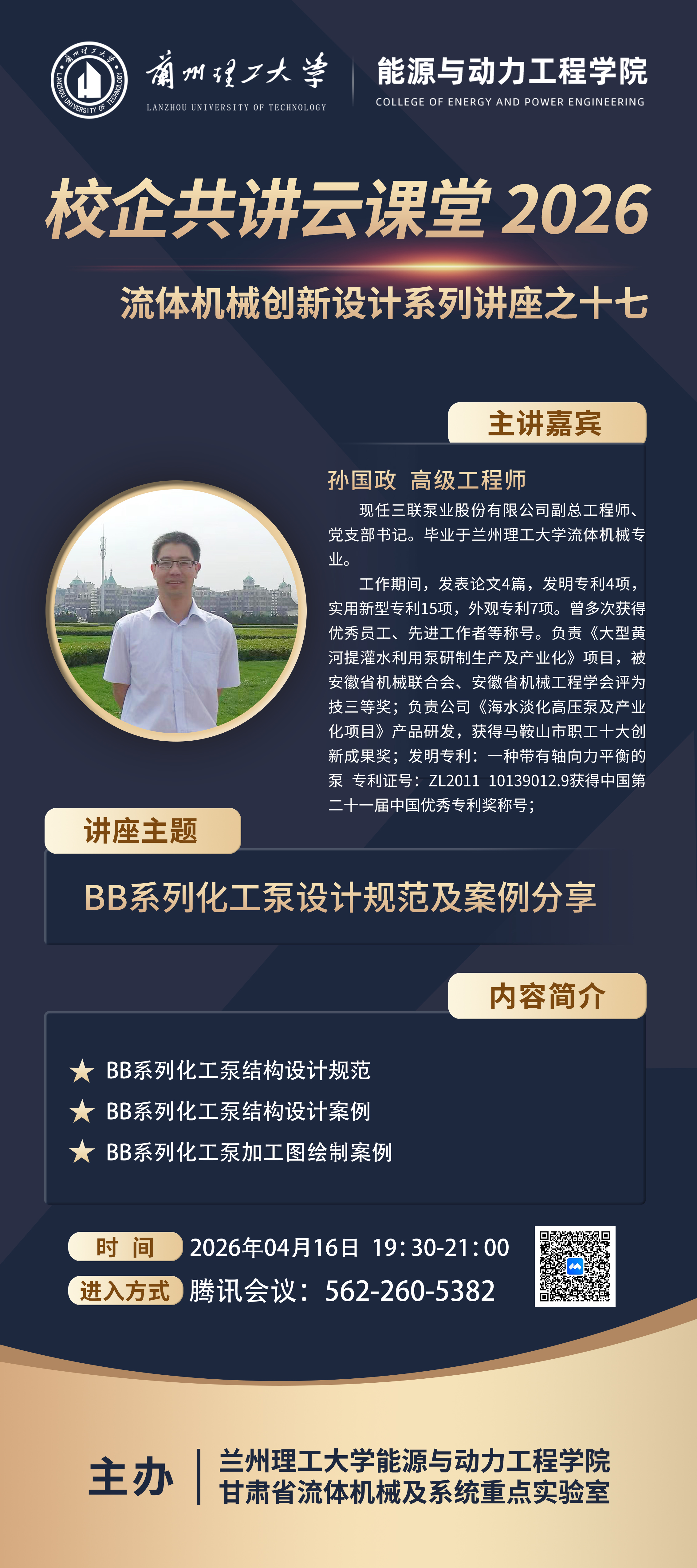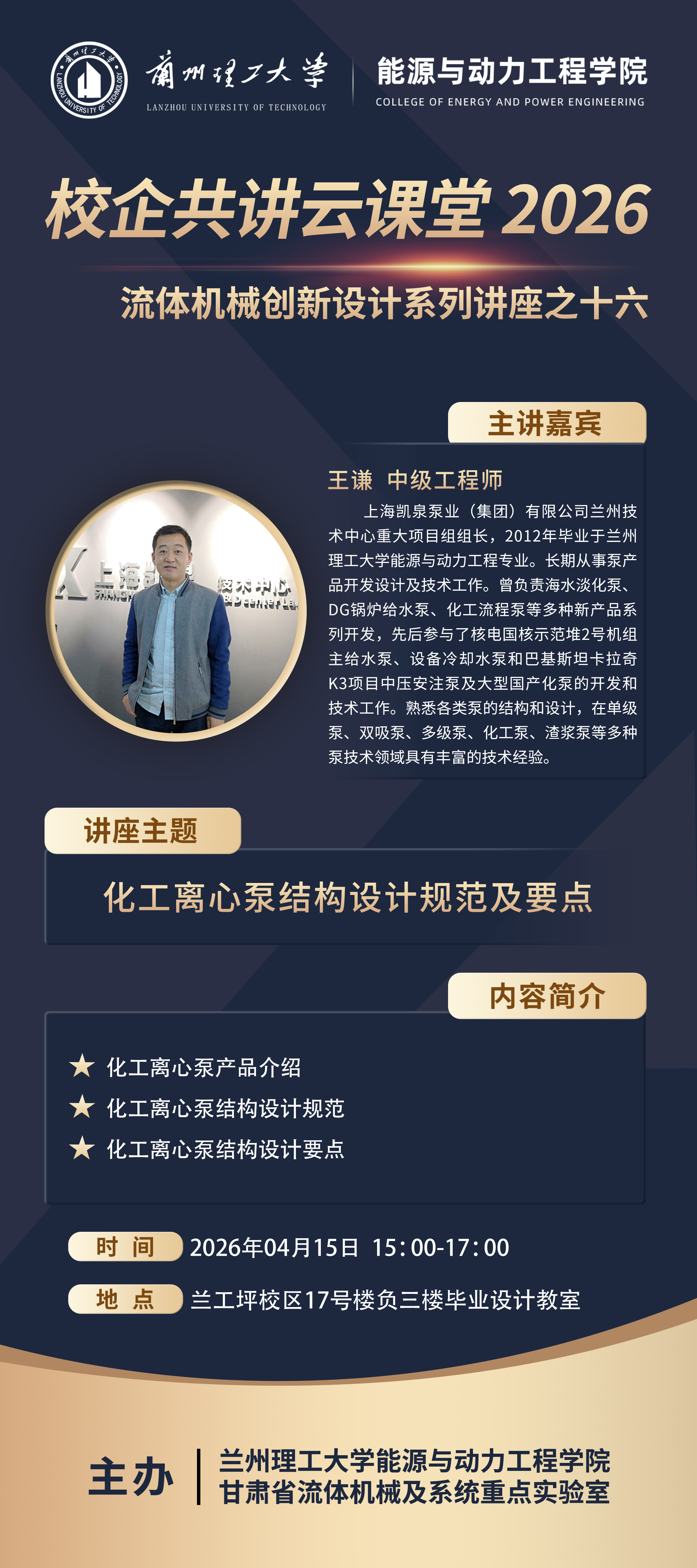 4月15~16日,能源与动力工程学院“校企共讲云课堂”系列讲座十六、十七开讲。应学院邀请,上海凯泉泵业(集团)有限公司兰州技术中心副主任王谦和安徽三联泵业股份有限公司副总工程师孙国政为能源与动力工程专业师生就化工离心泵结构设计规范及要点和BB系列化工泵设计规范及案例进行了讲解辅导。2026届能源与动力工程专业全体本科生及流体机械及工程系青年教师等100余人参加了此次讲座。