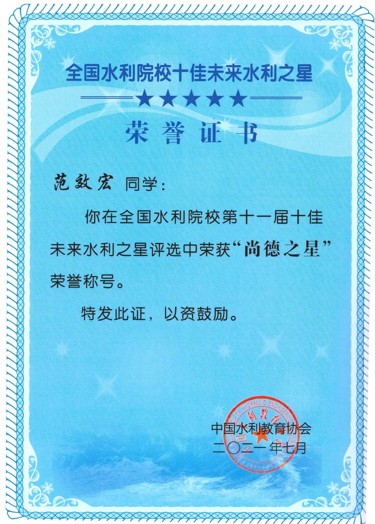 由中国水利教育协会、教育部高等学校水利学科教学指导委员会联合开展的全国水利院校第十一届十佳未来水利之星评选结果揭晓。兰州理工大学能源与动力工程学院水利水电工程专业2018级1班的范效宏同学被推荐为“全国水利院校第十一届十佳未来水利之星尚德之星”。