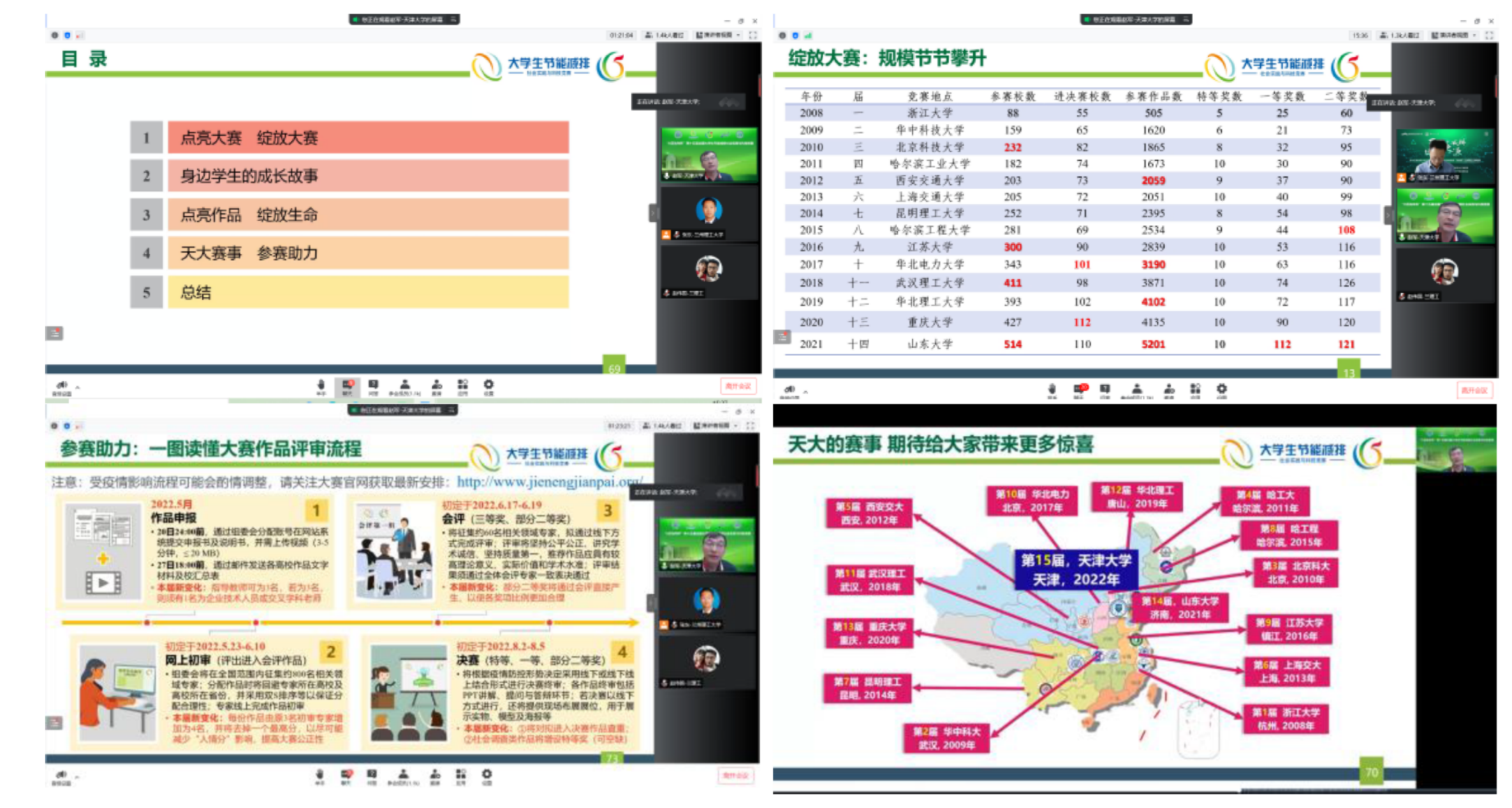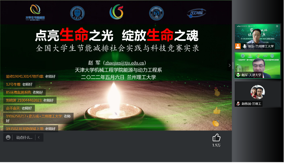 5月6日下午,兰州理工大学节能减排大赛专场报告会在线上顺利举办,特邀中国工程热物理学会工程热力学分会委员、天津市可再生能源学会理事长、第十四届全国大学生节能减排科技竞赛专家委员会副秘书长、天津大学机械工程学院赵军教授,以“点亮生命之光,绽放生命之魂”为主题,分享全国大学生节能减排社会实践与科技竞赛的大赛精髓、价值追求、典型作品。除了兰州理工大学的参赛同学外,还吸引了全国20所高校的近2000名师生参加,进一步扩大了我校在该领域的影响力。报告会由能源与动力工程学院副院长赵伟国主持。