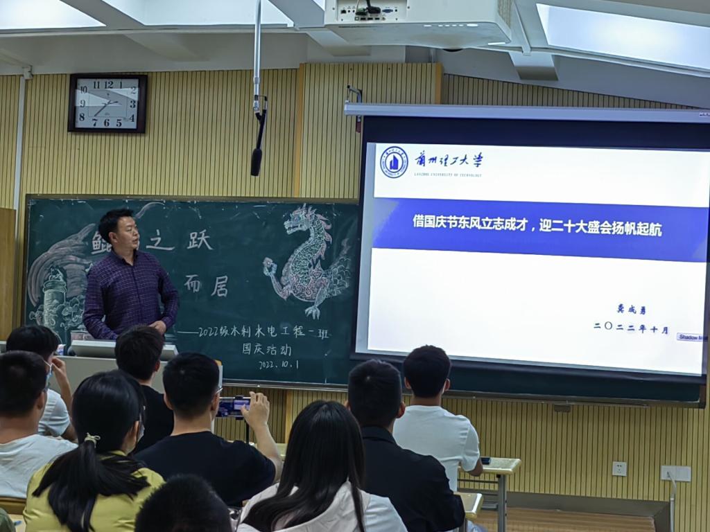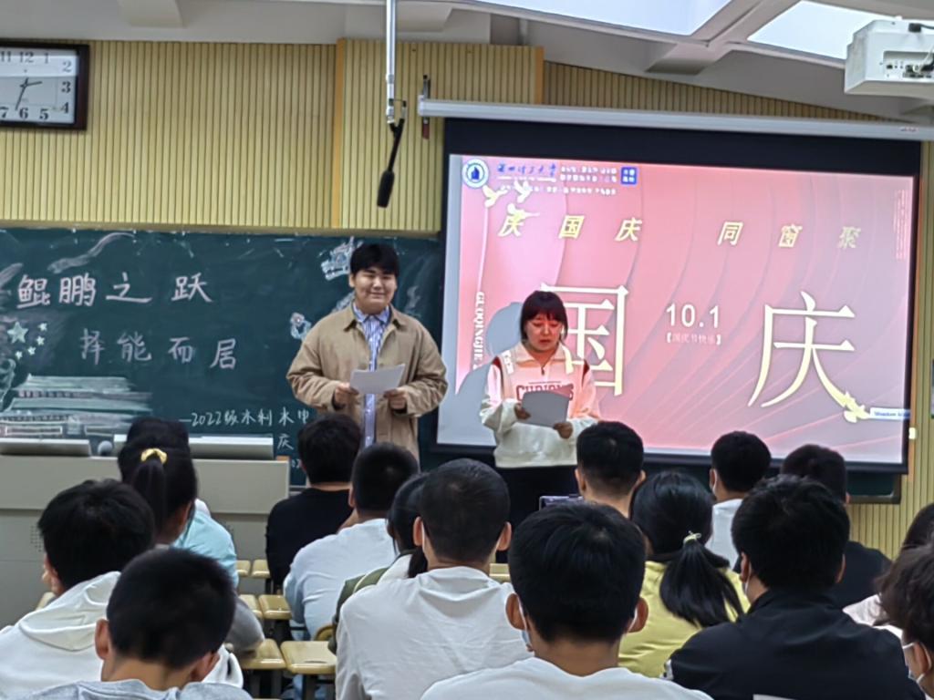 10月1日,恰逢举国庆祝国庆佳节,水利水电工程2022级1班在崇理楼108教室召开的主题为“国庆节感恩祖国,开启奋进新征程”爱国教育主题活动。活动以主题班会的形式开展,主题班会借助国庆佳节培养新生的爱国情怀,同时利用该活动帮助新生尽快大学生活和学习环境,为新生搭建学习交流成长的纽带,该主题班会是本班级开展的新生入学教育的重要环节。本次活动由新生郜文远和卢茹慧主持,班主任龚成勇老师和副班主任张辉以及水利水电工程2022级1班全体同学参加。活动采用线上与线上相结合的形式。