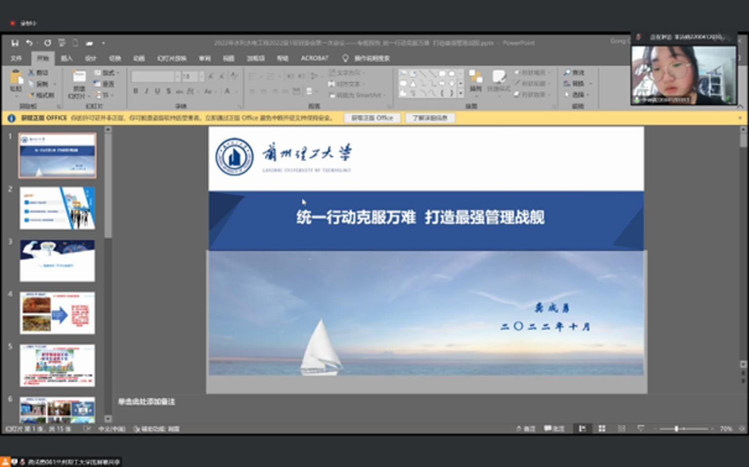 10月8日,水利水电工程2022级1班开展疫情条件下班委技能培训及其班级建设扩大会议,会议主题是理清班委工作思路,为班级同学做好服务。为了应对疫情反弹,确保学生学生学习生活的安全,克服疫情影响新生学习生活状态,加强特殊环境下学生引导和管理,发挥大学生自我管理培养与教育,引导学生遵守大学生行为规范,服从学校学院宿舍管理,同时克服疫情期间造成不适,一方影响新生对大学学习生活的误解,进一步帮助新生开启大学奋进新篇章。会议由班主任龚成勇主持,参会人员包括本班班委会成员、新生宿舍长和学科竞赛兴趣小组负责人共计26人。会议采用在线会议形式,会议包括班委阶段性工作总结及各班委说明近期工作内容、班主任主题报告、重点工作安排与部署等内容。