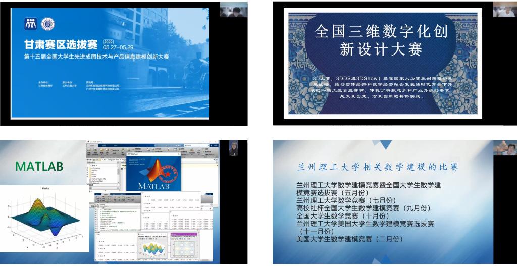 两个学习兴趣小组经历三周策划、准备该专项活动,为了提高该活动的效果和质量,数学与数学建模兴趣小组承担“彰显‘数字’可视技术”模块,由祝源浩和魏宇轩主持,祝源浩、罗荣宇、李浩维和高国庆代表兴趣小组介绍中国创意挑战大赛、“高教杯”全国大学生先进成图技术与产品信息建模创新大赛和全国三维数字化创新设计大赛等赛事的竞赛内容、形式及竞赛特征等内容;几何建模与数字化成图及可视化兴趣小组承担“探究‘模型’表达魅力”模块,由魏宇轩主持,由马宗娜、何小鹏、帕提古丽、张宇鹏、罗晓龙等同学分别介绍全国大学生数学建模竞赛(CUMCM)、“电工杯”数学建模比赛、“深圳杯”数学建模比赛、美国大学生数学建模比赛、MathorCup数学建模比赛和东北三省数学建模比赛等赛事。通过两个模块内容的介绍,新生同学基本了解了上述赛事的基本要求和流程,为后期准备学习和准备参加竞赛理清学习与竞赛准备,相关内容的分享进一步告诉新生同学参加上述竞赛需要同学们认真准备,并参与相关训练方可克服竞赛的难点。