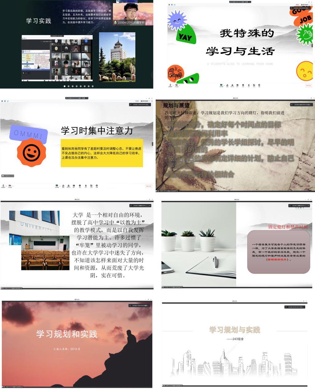 20:00活动开始,其主要包括居家学习探讨及分享、以宿舍为单位分享在校宿舍学习感受。利用PPT宣讲形式展示有关学习规划和实践的基础内容,向同学们说明规划未来的重要性,规划未来对每一个同学的意义,未来和实践的关系等主要的内容。其中同学们交流最多的问题主要包括:大学学习与高中存在本质差异,同学们已经基本适应;疫情对大学的学习生活的影响比较严重,尤其隔离的状态下开展线上教学,精力不能很好集中,学习过程相对枯燥,在线效果还是较差;在隔离期间同学们同样有自己的思考,都不同程度第经历了从着急到清醒过程;其中一部分同学被感染隔离,心态也发生了诸多变化,疫情也教会同学们成长,但是确实影响了学习效果;大部分同学都加入了学生社团和相应的组织,对大学生活还是比较憧憬;学习已经逐步进入正轨,但是学习与考试的还是有点担心;当前课程已经结课,进入复习考试的环节,学习的状态逐步找回来了,总体还是有担心挂科的心理负担;疫情期间班级的活动对同学们起到很好地引导作用;疫情期间学校值班的老师比较辛苦,他们所做的事情及对同学们的关怀,尤其严格防疫对各位同学都是榜样的作用。