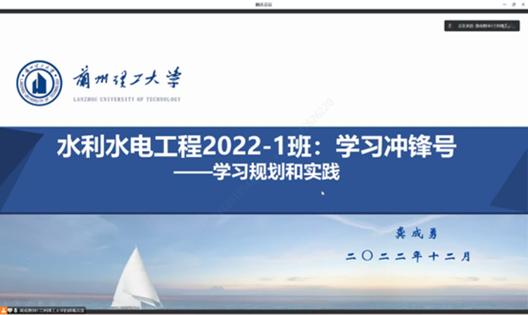 1211日,水利水电工程2022-1班开展新学期疫情期间学习规划和实践交流分享会,是班级组织的“学习冲锋号”主题活动的第一模块。活动由学习委员卢茹慧策划。主题班会借期末紧张的复习氛围,同时利用该活动帮助同学尽快了解学习规划和实践,为同学搭建学习交流成长的纽带,该主题班会是本班级开展的同学规划教育的重要环节。本次活动由魏泰明同学主持,班主任龚成勇老师全程参与,全体同学参利用腾讯会议积极参加活动。