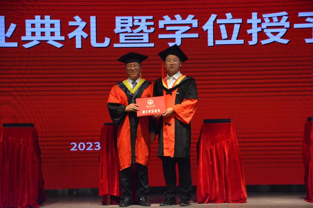 毕业典礼在庄严的国歌声中开始。赵伟国宣读《关于准予2023届5533名本科生毕业的决定》,韩伟宣读《关于2023年春季学期授予漆宇晟等7632人学位的决定》,章小成宣读《兰州理工大学关于表彰2023届优秀毕业生的决定》。学院领导为优秀毕业生代表颁发荣誉证书。