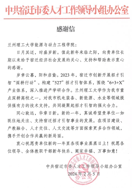 2月5日,中共宿迁市委人才工作领导小组办公室向我院发来感谢信,感谢学院长期以来对宿迁人才招聘和社会发展作出的贡献。