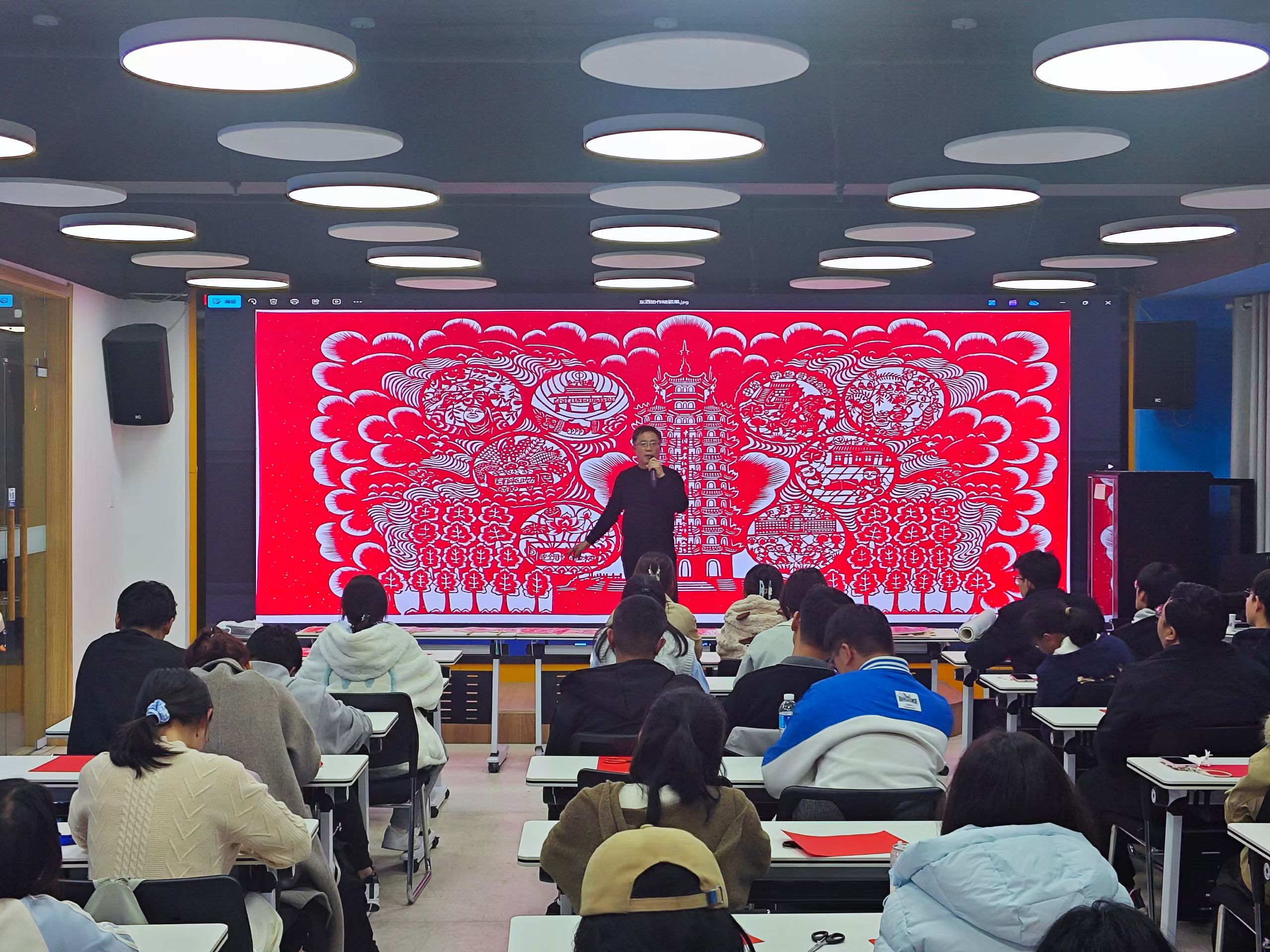 王新胜老师以“中国民间剪纸艺术”为主题,从剪纸的历史渊源、艺术特点及地域风格等方面进行了详细讲解。随后,他展示了多幅精心创作的剪纸作品,涵盖花鸟、人物、吉祥图案等多种类型,精美的造型和细腻的工艺让同学们赞叹不已。在实践操作环节,王老师手把手指导大家剪“福”字。从纸张的折叠方法到剪刀的使用技巧,他都耐心细致地示范讲解。同学们认真学习,积极尝试,师生间互动频繁,气氛热烈。
