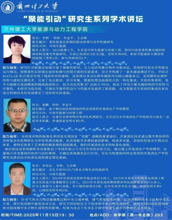 11月15日,能动学院举办“聚能引动”研究生系列学术论坛。活动邀请到学院博士研究生李辉、秦鹏和李发达三位同学作报告,学院相关专业研究生参加。