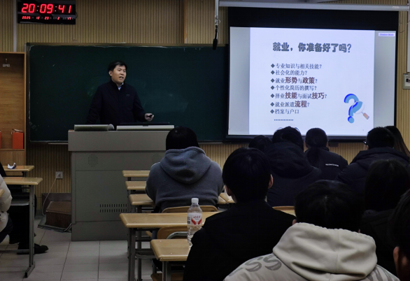 主会场由年级辅导员杜丽芳主持会议,特邀相关负责教师赵继国、董季澄分别就考研政策与本校考研情况、就业形势与政策进行专题讲解。