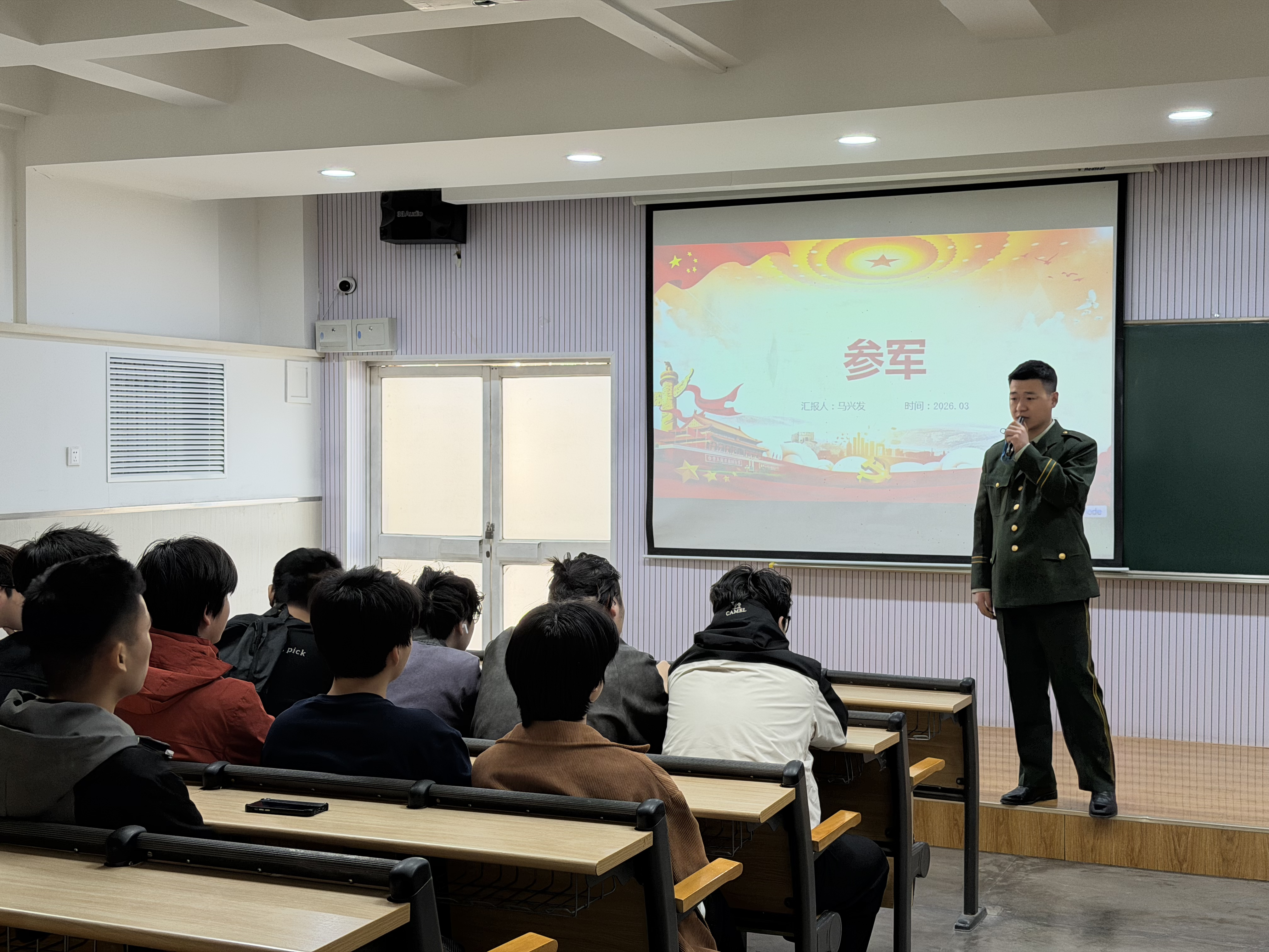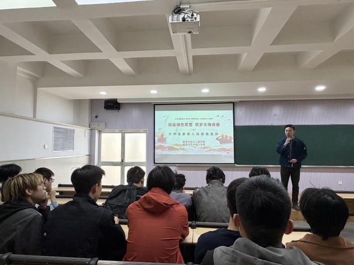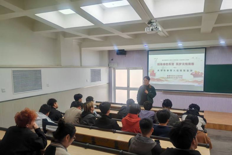 为深入贯彻习近平强军思想和新时代军事战略方针,坚持立德树人根本任务,持续加强高质量思政工作体系建设,厚植青年学子家国情怀,引导青年学生将个人理想融入强国强军伟大事业,2026年4月9日上午,能源与动力工程学院、建筑与艺术设计学院联合举办征兵动员宣讲会。能动学院“最美退役大学生”马兴发受邀主讲,两学院征兵工作专员及毕业生80余人参加活动。